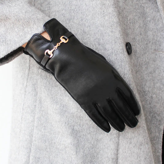 Faux Leather Gloves w/ Gold Buckle Accent-Black