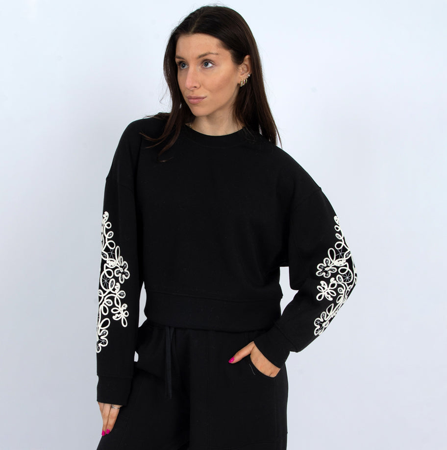 The Lucie Pullover in Black Cala Lily is crafted from soft scuba fabric that offers gentle warmth and comfort. Its embroidered sleeve detail adds a subtle touch of elegance, making it perfect for both casual wear and relaxed gatherings. This cozy pullover supports your everyday comfort while elevating your style effortlessly.