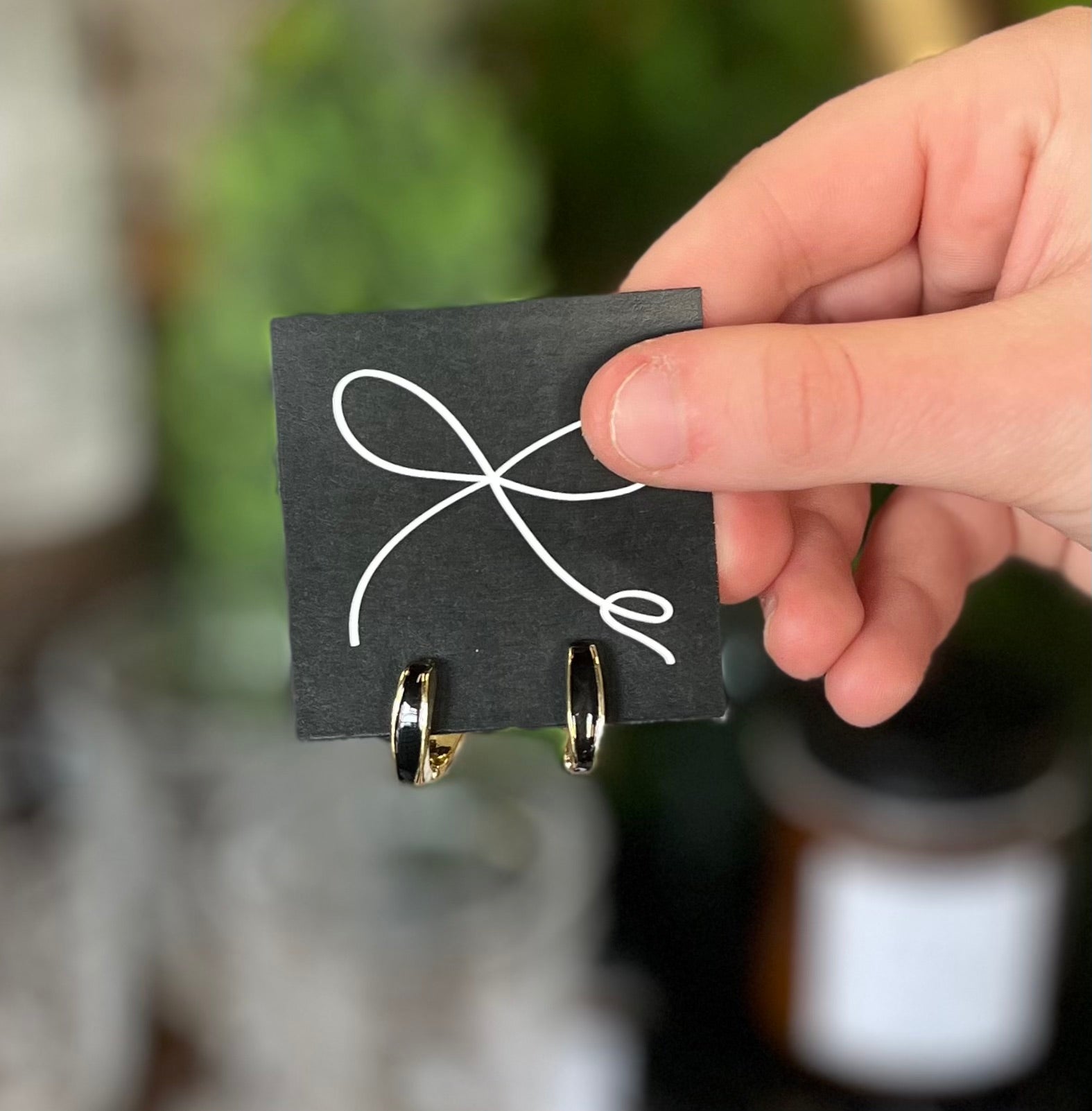 Sleek black enamel hoops that make a statement without the fuss. Lead-free and crafted for everyday wear, these petite loops offer timeless style with a modern edge. Perfect for layering or wearing solo.